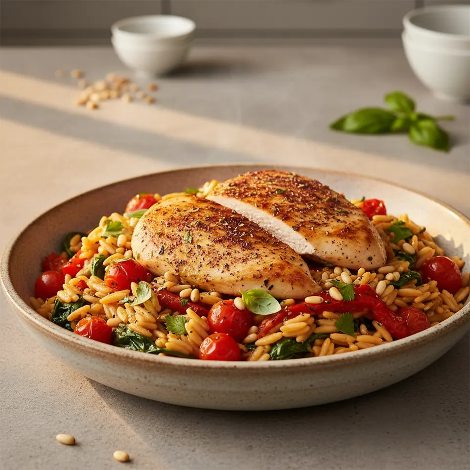 - While orzo cooks, heat 1 tbsp olive oil in a large skillet over medium-high heat. Add seasoned chicken breasts and sear for 5-7 minutes per side, until golden brown and cooked through (internal temperature 165°F/74°C). Remove chicken from skillet, tent with foil, and let rest for 5 minutes. Slice thinly or dice.