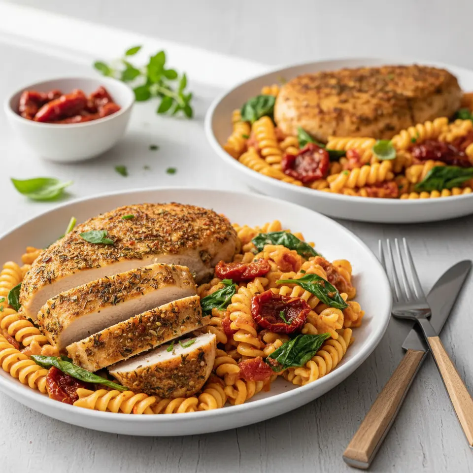 Award-Winning Mediterranean Herb-Crusted Chicken with Sun-Kissed Legume Pasta