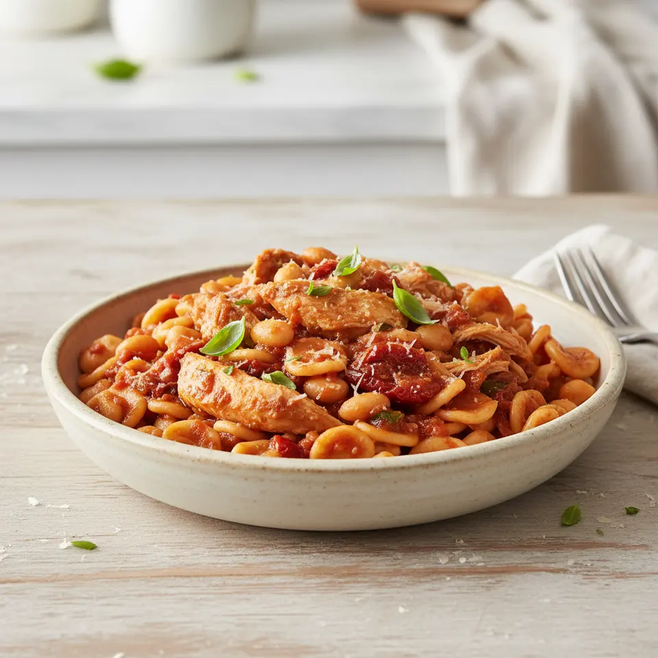 Award-Winning Tuscan Herb Chicken & White Bean Ragu with Sun-Dried Tomato Chickpea Orecchiette