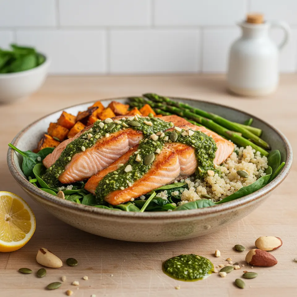 - To assemble: Divide the cooked quinoa between two bowls. Top each with roasted sweet potatoes and asparagus, wilted spinach, and a pan-seared salmon fillet. Drizzle generously with the Brazil Nut Pesto. Serve immediately with lemon wedges.