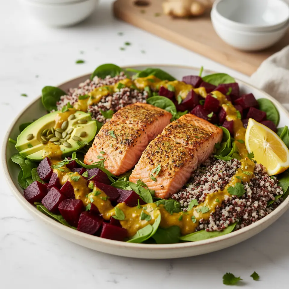 - Assemble the bowls: Divide the baby spinach or mixed greens between two serving bowls. Top with cooked quinoa, roasted beets, and flaked salmon. Garnish with sliced avocado and a sprinkle of pumpkin seeds. Drizzle generously with the Zesty Turmeric-Ginger Dressing.
