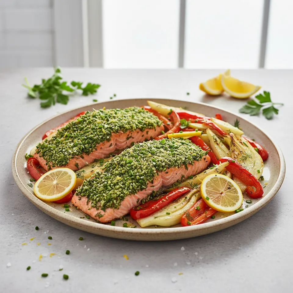 Emerald Herb-Crusted Salmon with Roasted Lemon-Fennel & Bell Pepper