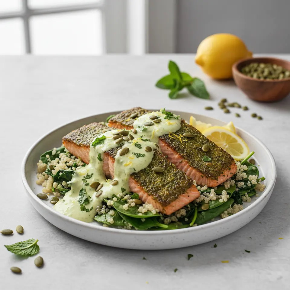- Assemble and Serve: Divide the cooked quinoa and sautéed spinach evenly between two plates. Place one salmon fillet on top of each bed of quinoa and spinach. Drizzle generously with the Lemon-Herb Tahini Drizzle. Sprinkle with pumpkin seeds and a little lemon zest. Serve immediately.