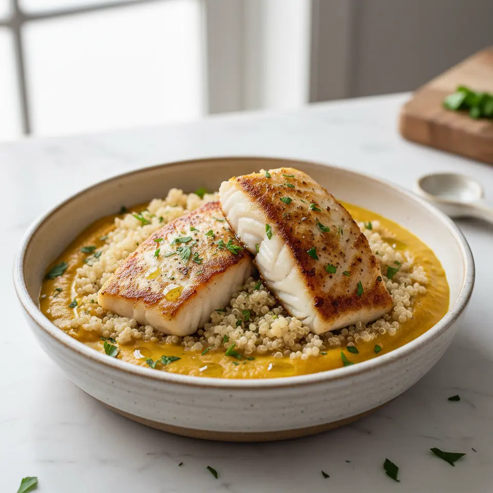 - To assemble, divide the cooked quinoa between two bowls. Spoon a generous amount of the golden nurture sauce over the quinoa. Gently place a pan-seared cod fillet on top of the sauce in each bowl. Garnish with fresh chopped parsley and a lemon wedge, if desired, for a bright finish.
