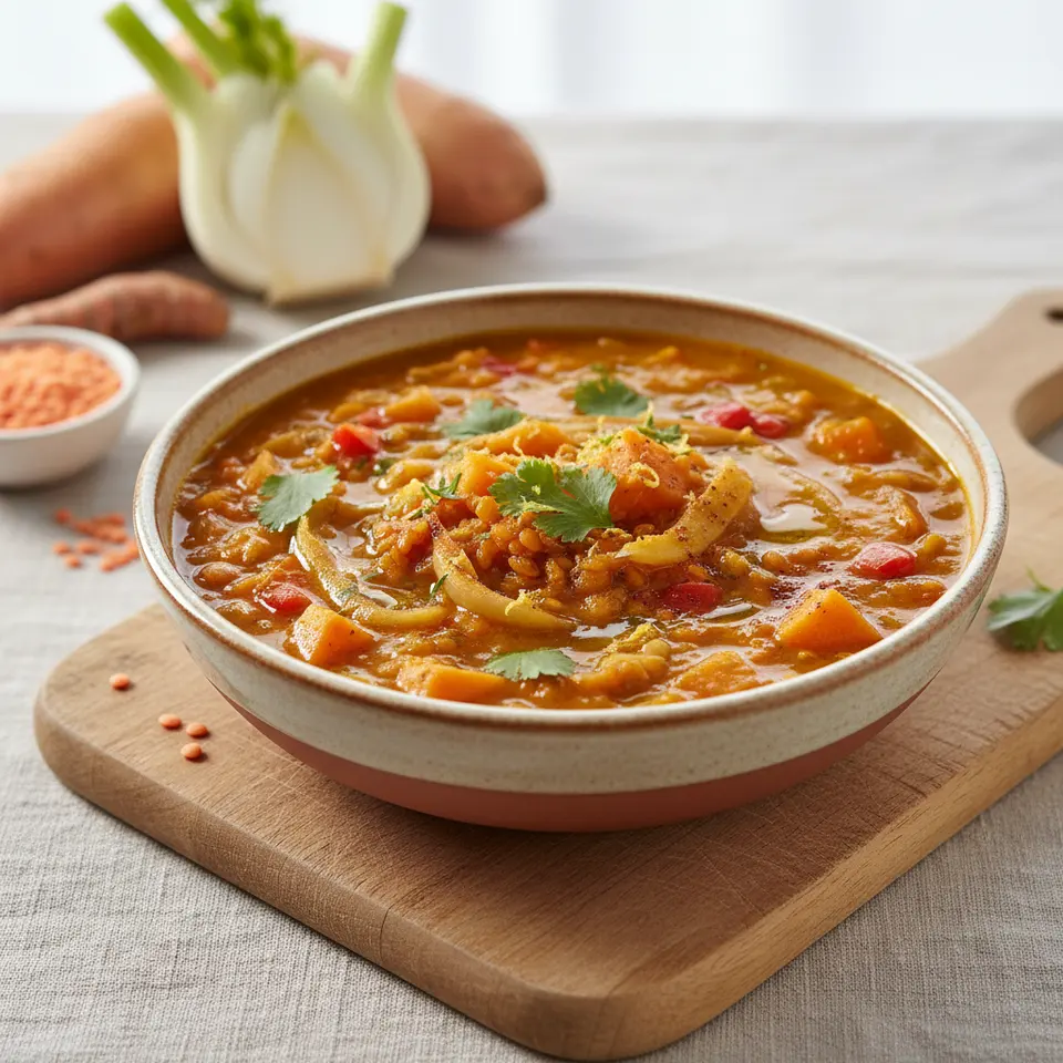 - Ladle the Golden Sunset Lentil & Fennel Stew into bowls. Garnish with additional fresh cilantro, reserved fennel fronds, and toasted pumpkin seeds if desired. Serve immediately.