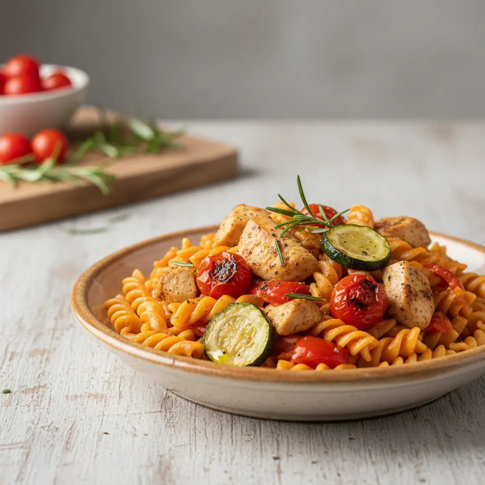 Golden Tuscan Sunset Pasta with Herbed Chicken & Rosemary-Infused Roasted Vegetables