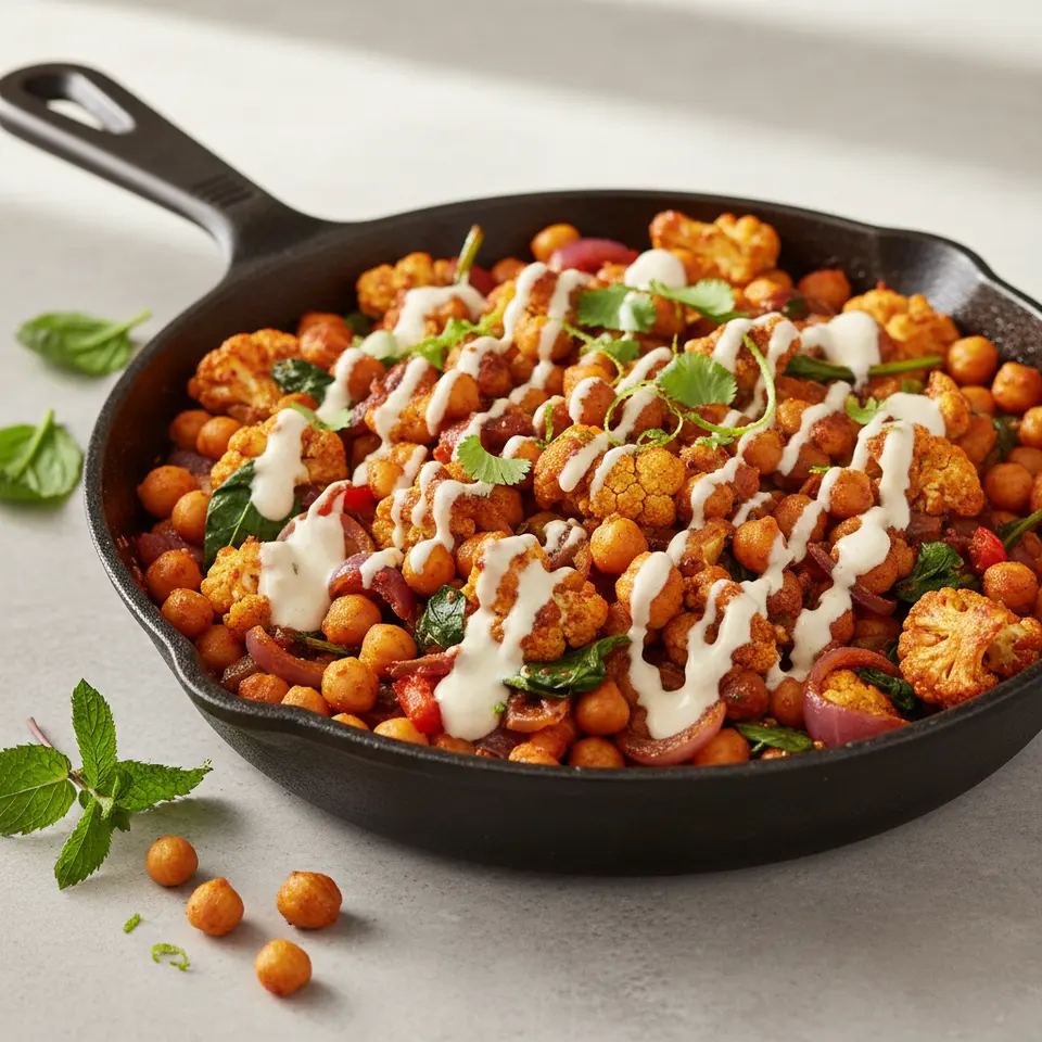 Harissa Spiced Chickpea & Cauliflower Skillet with Creamy Tahini-Lime Drizzle