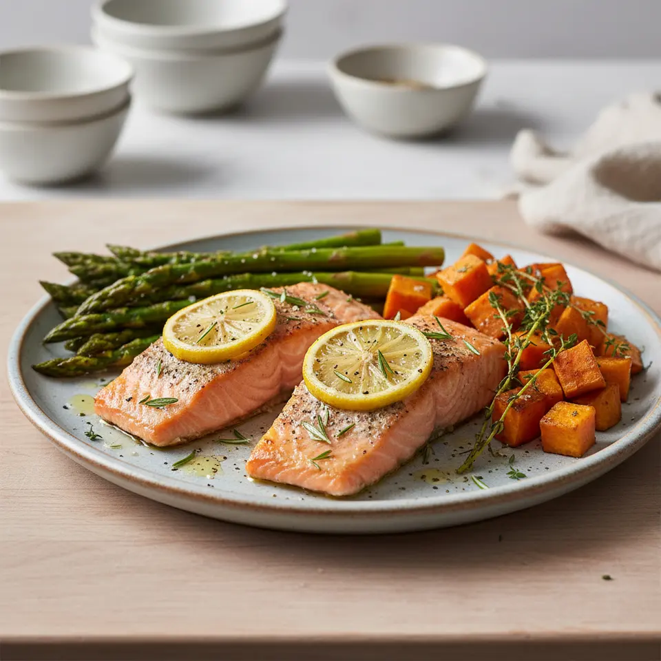 Lemon-Herb Baked Salmon with Roasted Asparagus and Sweet Potato