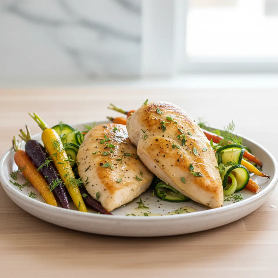 - Serve: Slice the rested chicken breasts. Divide the roasted carrots and zucchini ribbons between two plates. Top the chicken with the lemon-herb pan sauce and garnish with fresh dill or parsley, if using. Serve immediately.