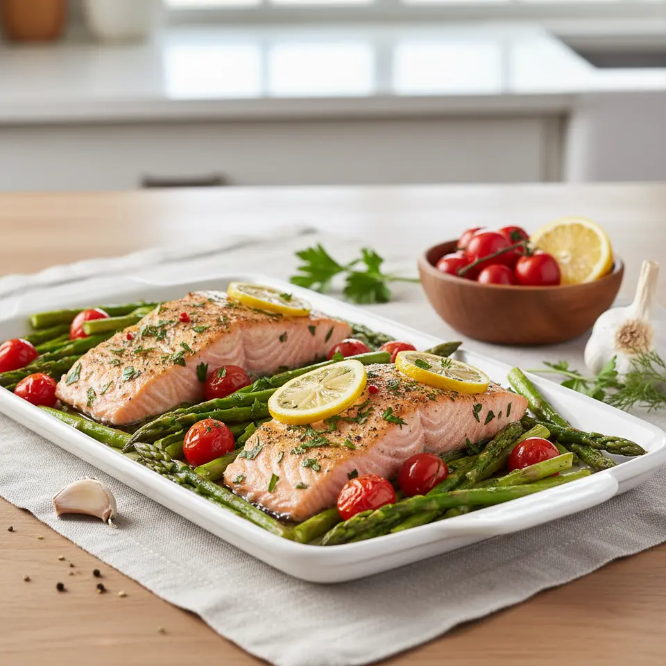 Lemon Herb Roasted Salmon with Asparagus and Cherry Tomatoes