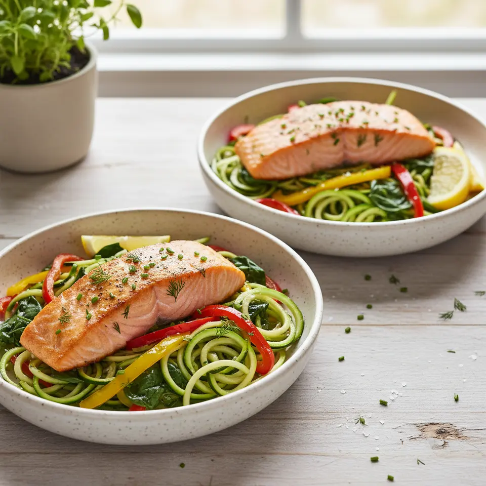 - Serve: Divide the dressed zucchini noodle and bell pepper sauté between two plates. Top each with a seared salmon fillet. Garnish with a lemon wedge and extra fresh herbs if desired. Serve immediately.