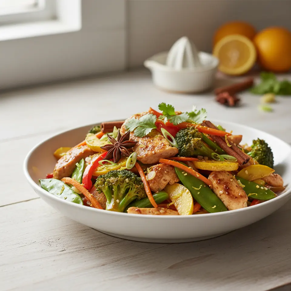 - Stir-fry vegetables 3–4 minutes; add garlic and ginger for 30 seconds.