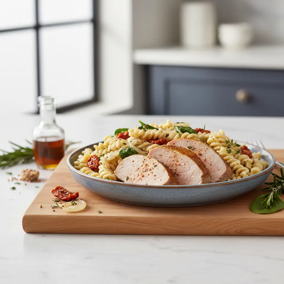 - Serve: Slice the rested pork tenderloin into medallions. Divide the creamy chickpea fusilli between two plates. Top each serving with sliced pork tenderloin. Garnish generously with fresh basil and toasted pumpkin seeds. Serve immediately.