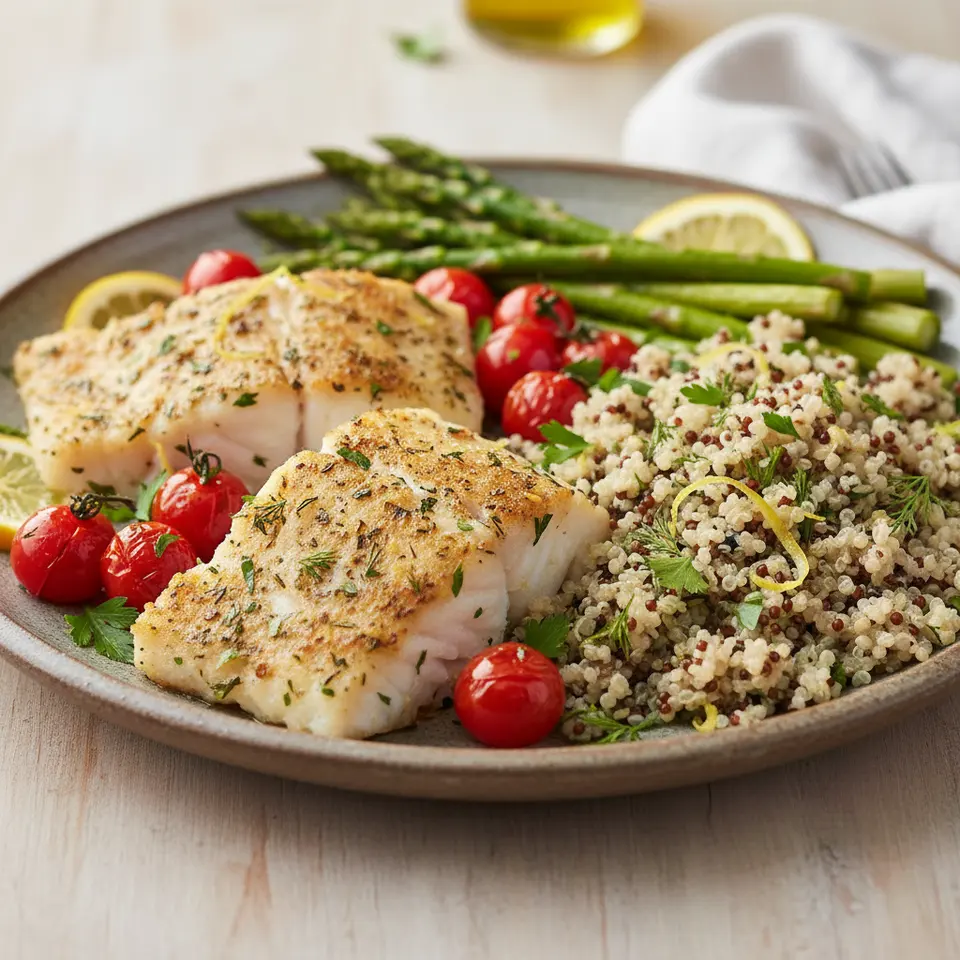 Mediterranean Baked Cod with Lemon-Herb Quinoa and Asparagus