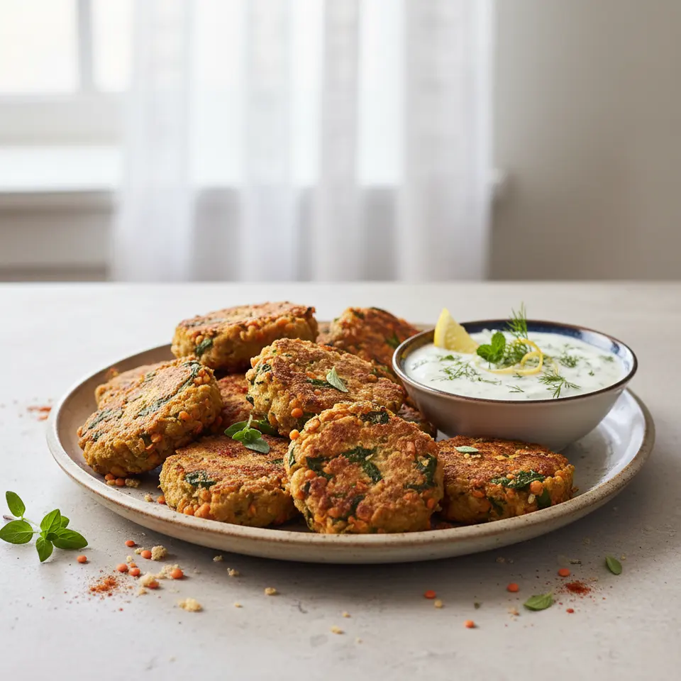 Mediterranean Chicken & Red Lentil Fritters with Zesty Herb Yogurt
