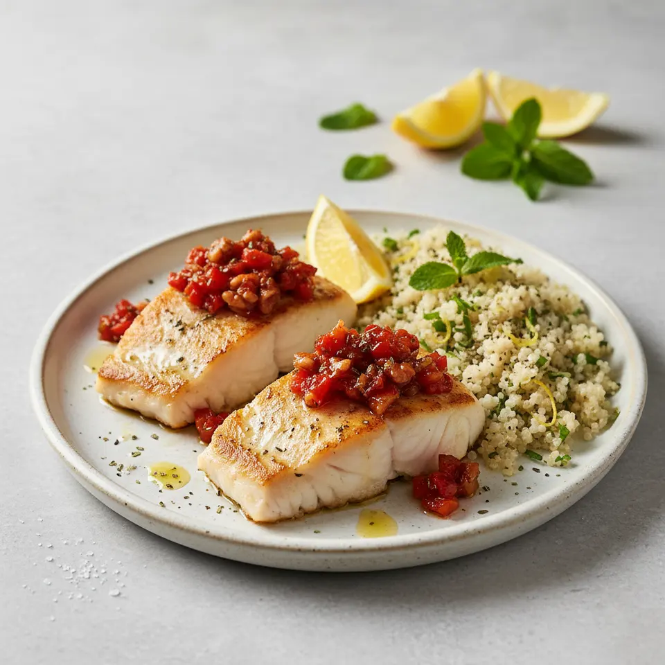 Mediterranean Pan-Seared Cod with Roasted Red Pepper & Walnut Relish and Lemon-Herb Quinoa