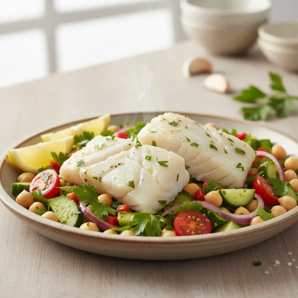 Mediterranean Poached Cod with Zesty Chickpea & Herb Salad