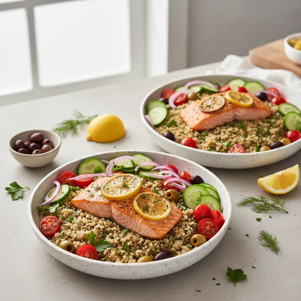 Mediterranean Quinoa Bowl with Lemon-Herb Baked Salmon