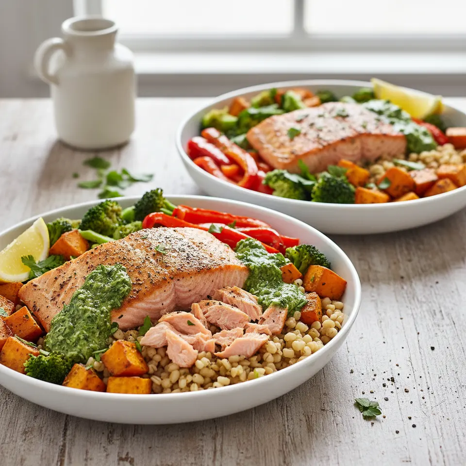 Mediterranean Salmon & Farro Power Bowls with Zesty Herb Dressing
