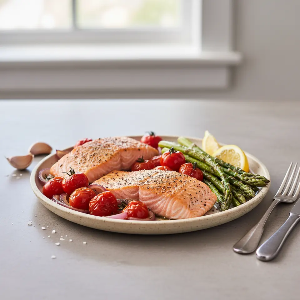 Mediterranean Salmon with Burst Cherry Tomatoes & Charred Asparagus