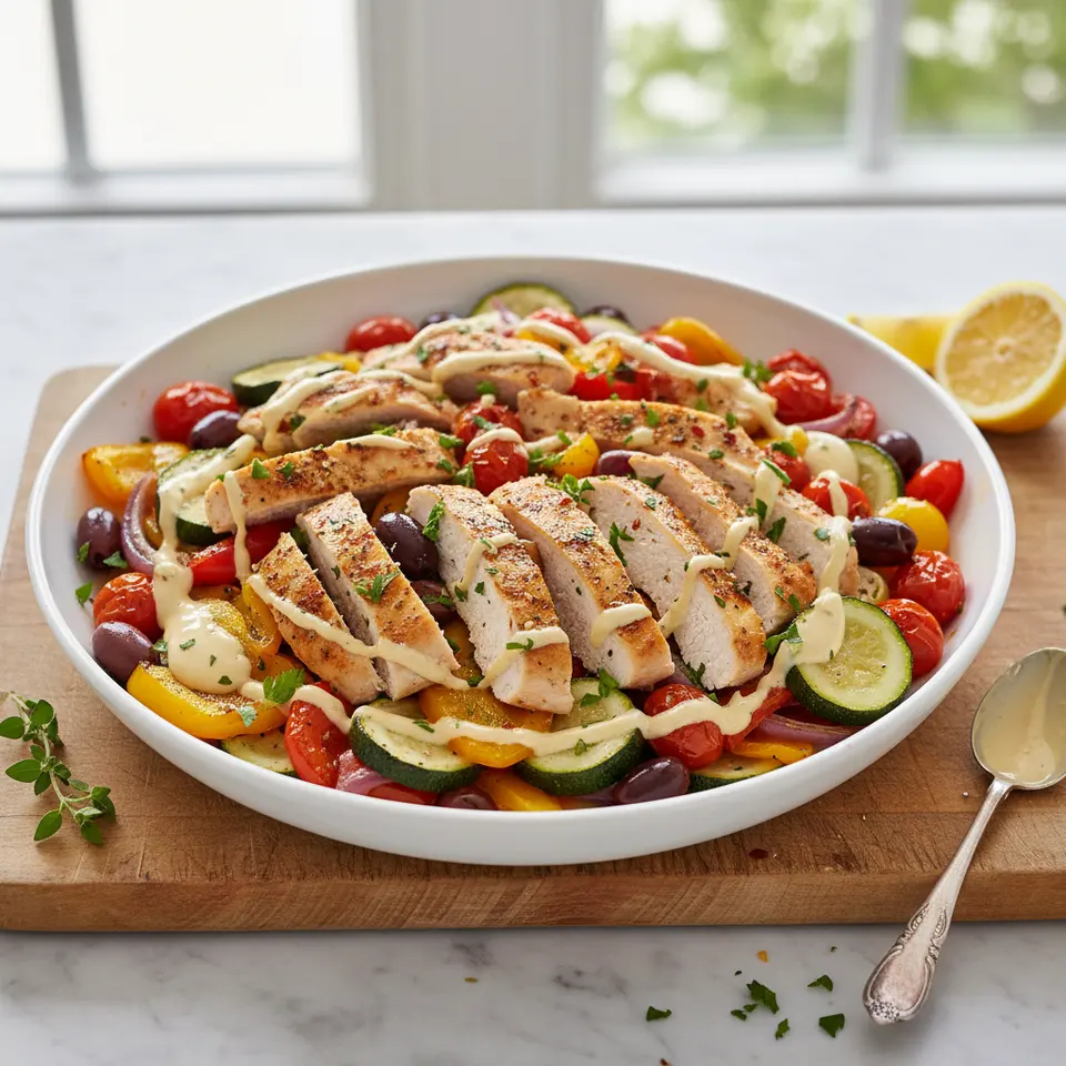 - Once cooked, remove the sheet pan from the oven. Divide the Mediterranean chicken and roasted vegetables evenly between two plates. Drizzle generously with the Zesty Tahini Drizzle and garnish with fresh chopped parsley before serving immediately.