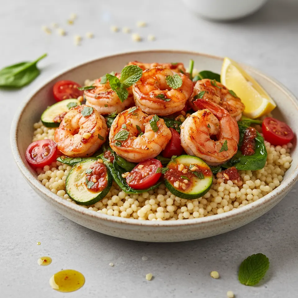 Mediterranean Shrimp & Pearl Couscous with Harissa-Mint Vinaigrette