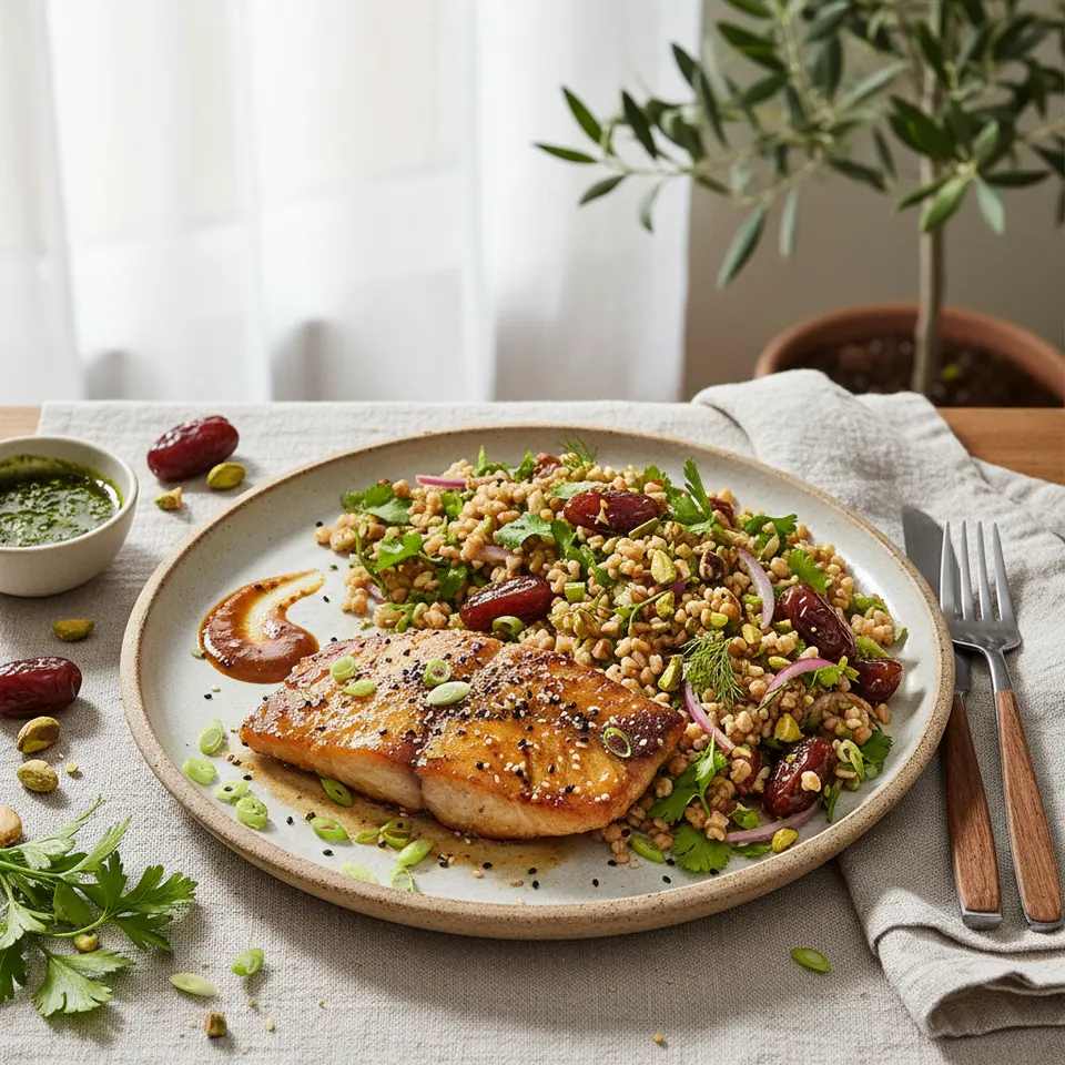 Miso-Glazed Sablefish with Persian Herb & Date Freekeh Salad