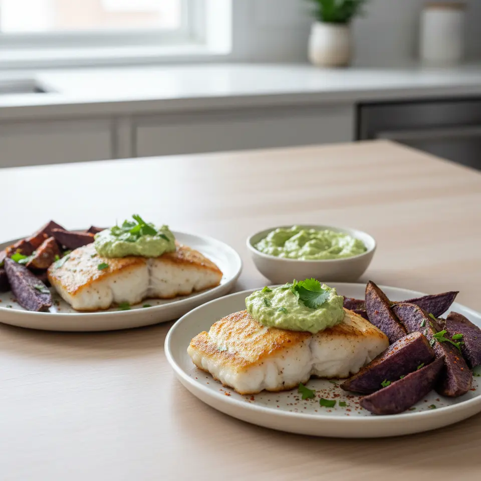 Pan-Seared Halibut with Zesty Avocado-Cilantro Pesto and Harissa-Spiced Purple Sweet Potatoes
