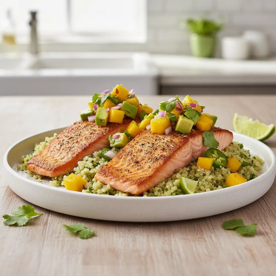 Pan-Seared Salmon with Zesty Mango-Avocado Salsa Verde & Cilantro-Lime Quinoa