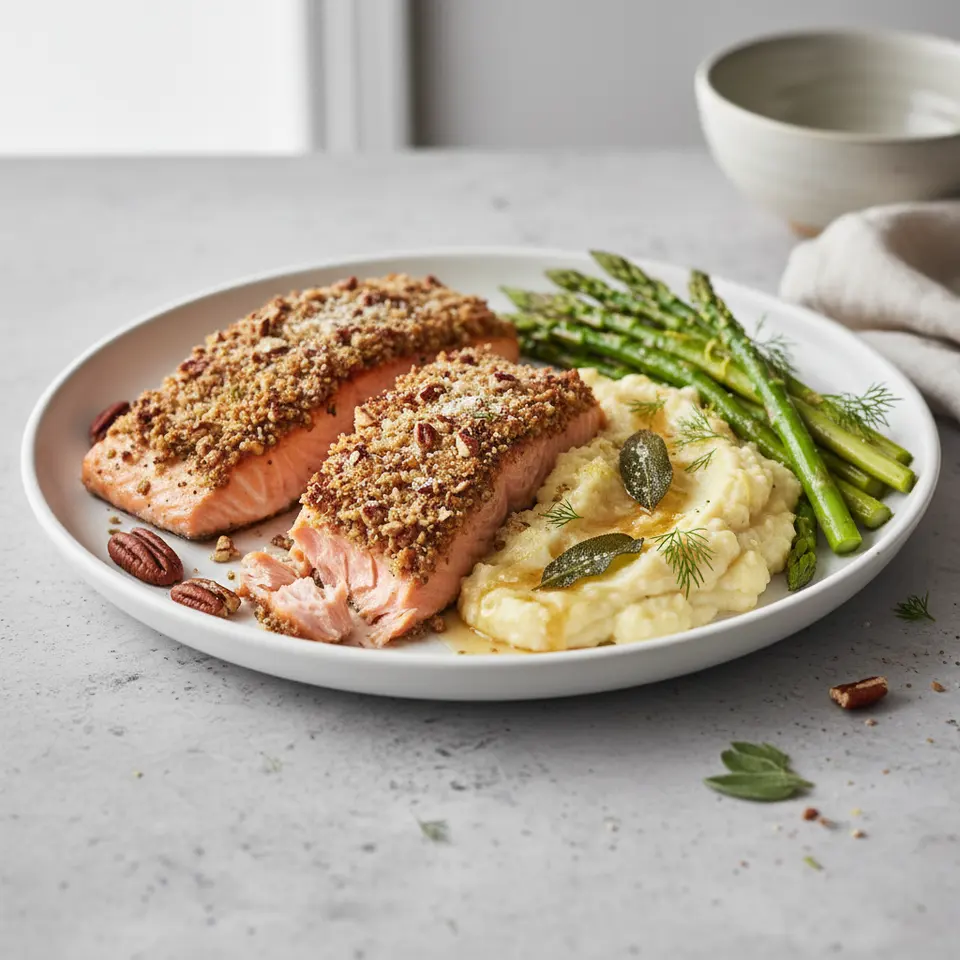 - Serve immediately: Place a generous dollop of brown butter sage cauliflower mash on each plate. Top with a pecan-crusted salmon fillet and serve the lemon-dill asparagus alongside.