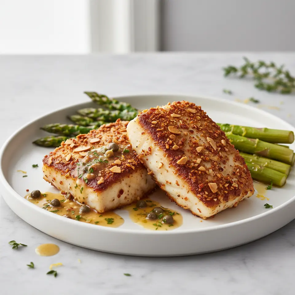 Smoked Paprika & Almond Crusted Halibut with Lemon-Garlic Asparagus and Brown Butter Caper Sauce
