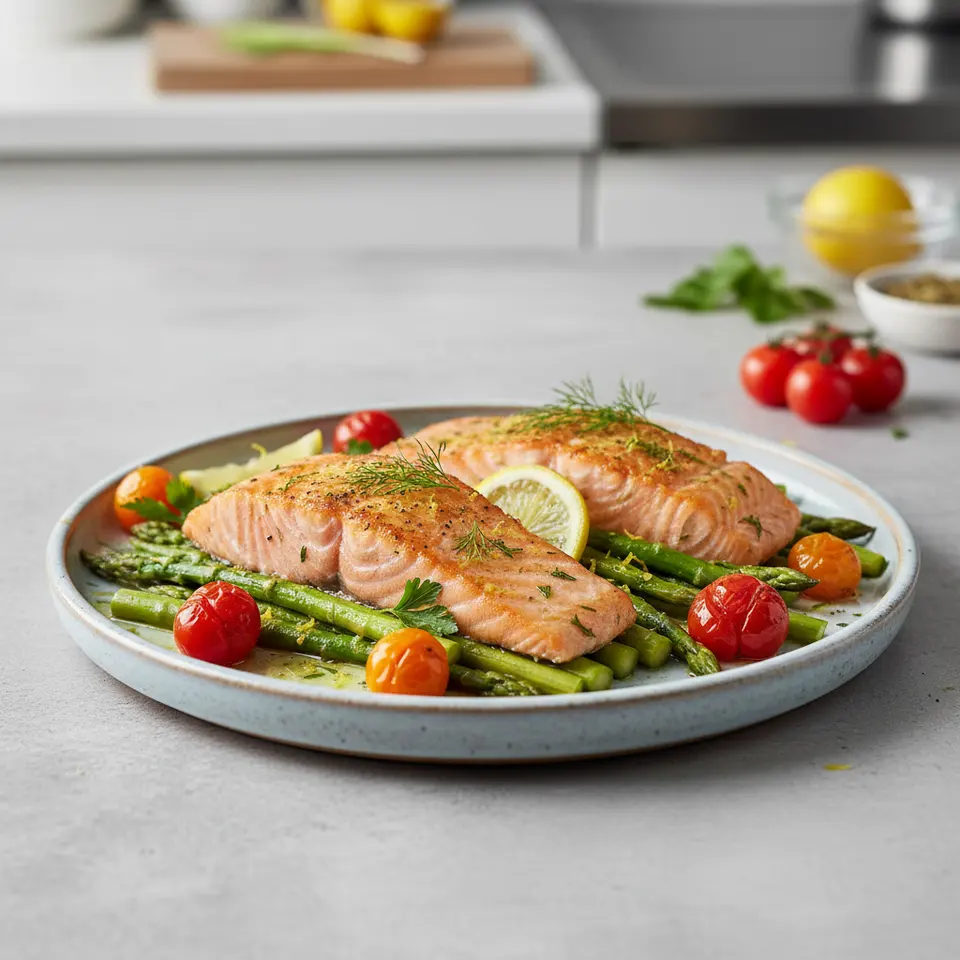 South Beach Lemon-Herb Baked Salmon with Asparagus and Cherry Tomatoes
