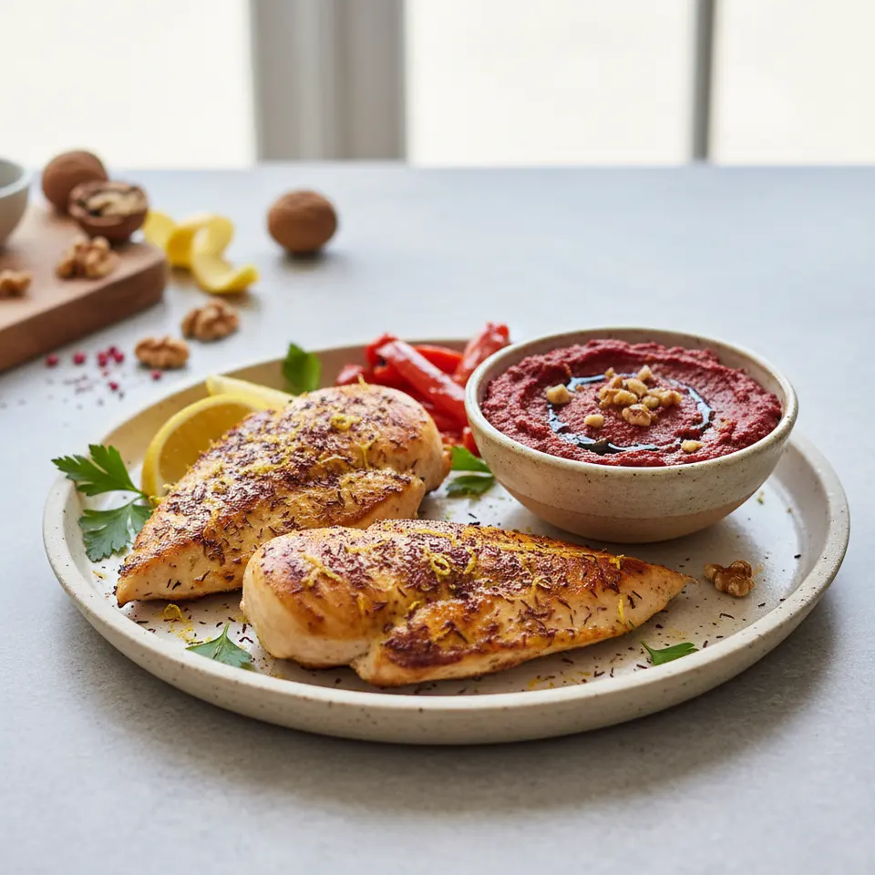 - Divide the Roasted Red Pepper & Walnut Muhammara between two plates. Slice the pan-seared chicken breasts and arrange them artfully over or alongside the Muhammara. Garnish with fresh chopped parsley or cilantro before serving.
