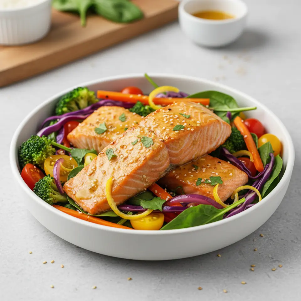 Turmeric-Ginger Glazed Salmon with Rainbow Vegetable Medley