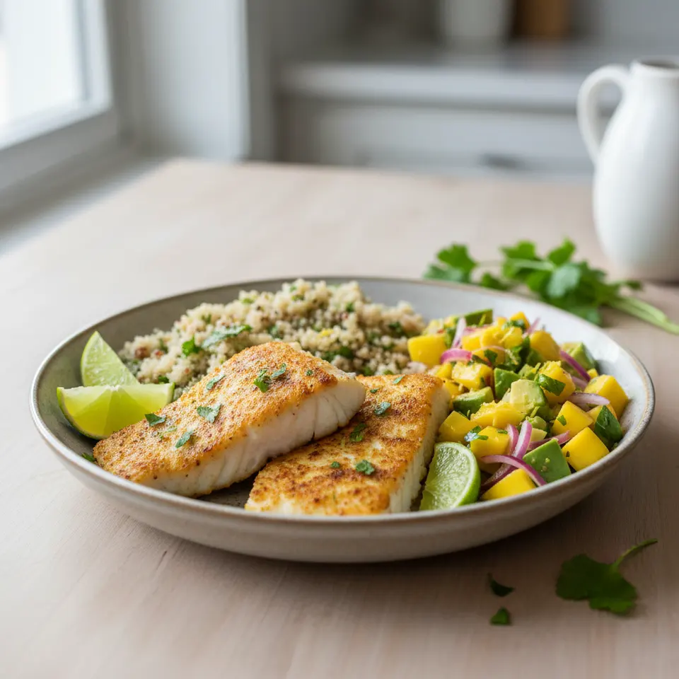 Turmeric-Lime Cod with Tropical Avocado Salsa and Herbed Quinoa