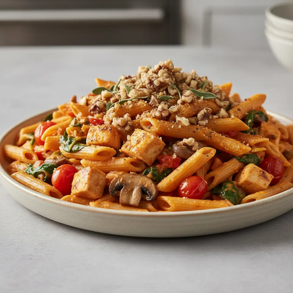 - Combine and Finish: Return the skillet to medium heat. Pour in the cauliflower-cream sauce. Add the cooked penne, seared chicken, sautéed mushrooms, and fresh spinach. Stir gently until the spinach wilts, about 1-2 minutes. Fold in the halved cherry tomatoes just before serving to retain their freshness.