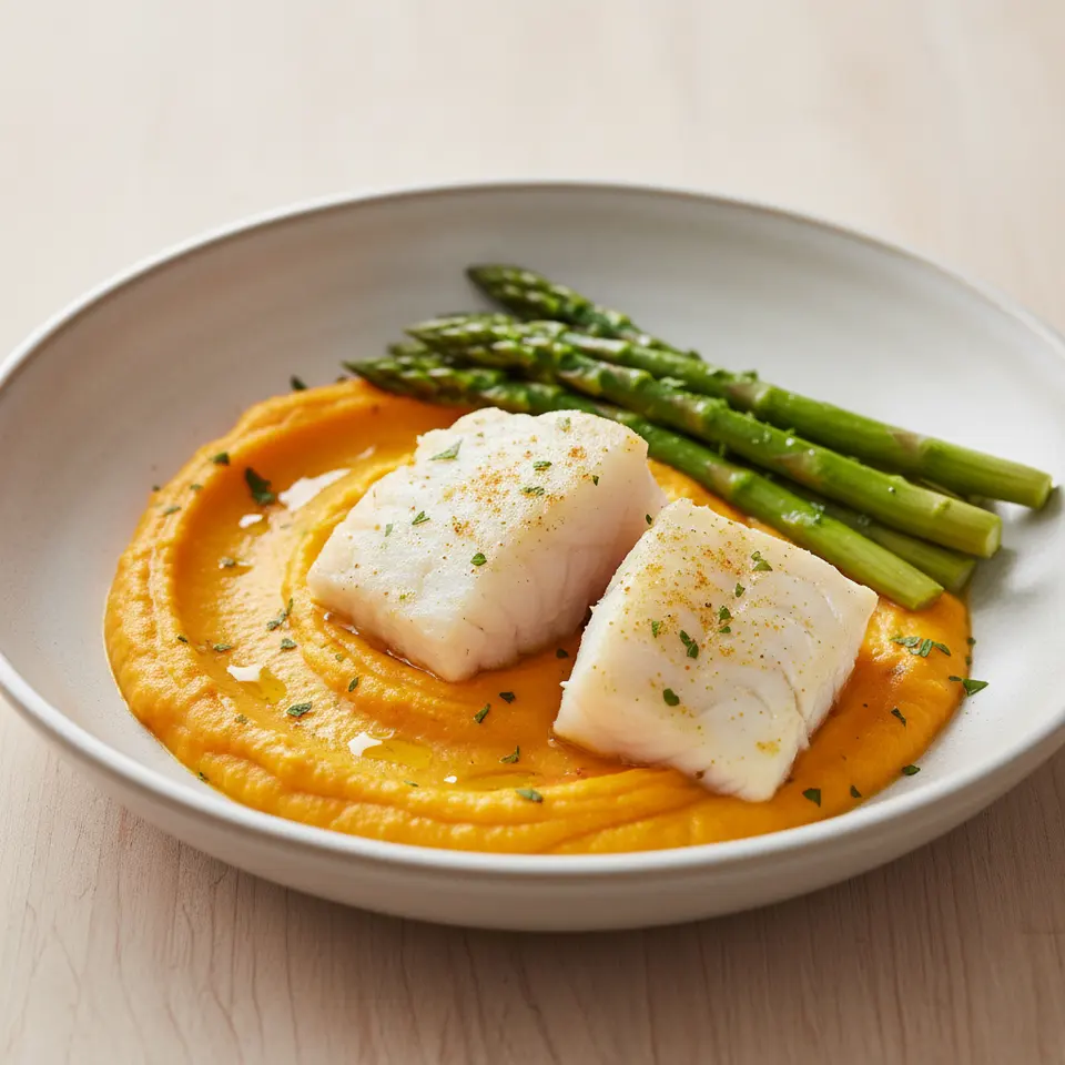 Velvety Turmeric-Ginger Cod & Carrot Purée with Steamed Asparagus