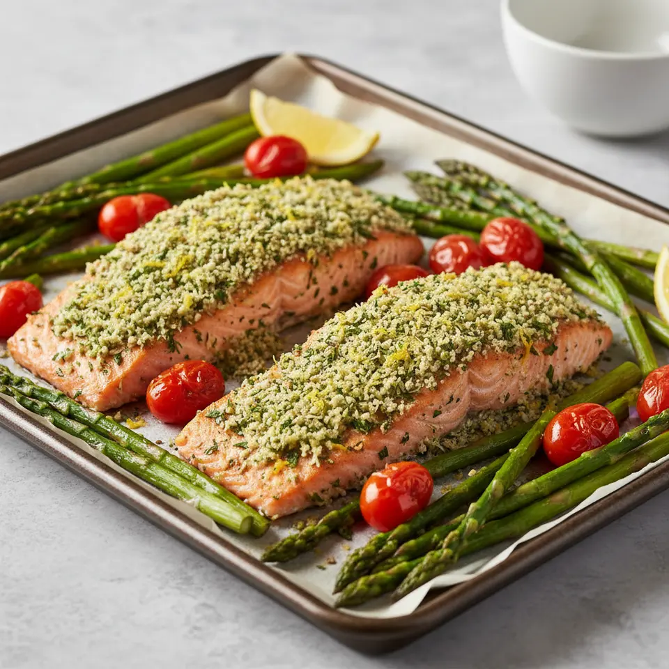 Zesty Herb-Crusted Salmon with Roasted Asparagus & Burst Tomatoes